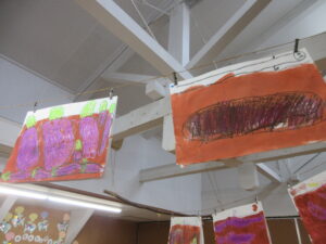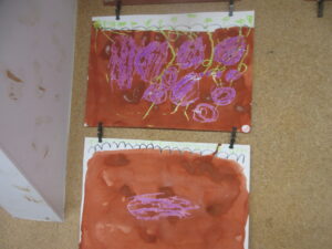 年中さん、年長さんは描いた最後には、茶色の絵具を塗ってみました!