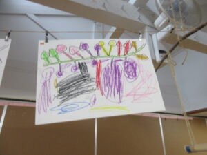 そして、その後は「どんなお芋が掘れるかな?」と年少さんはお芋のツルが描かれている画用紙に。年中さんは土とお空の区別された線が描いてある画用紙に。年長さんは真っ白な画用紙に。思い思いにイメージを膨らませながら描きました♪