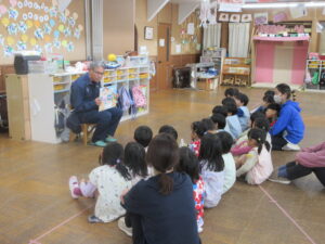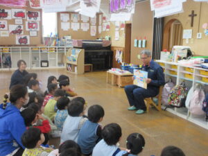 避難の様子を見ていただいたのち、お部屋で訓練の様子についてお話しいただき、火事のときの紙芝居を読んでくださいました。