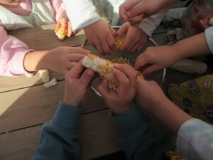 ポップコーンは3本残っていたので、一粒ずつ子どもたちが外してくれましたよ。数個は来年の種にするので残しました!!