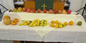 今日は、果物を持ち寄っての収穫感謝礼拝を行いました。 席に座 …